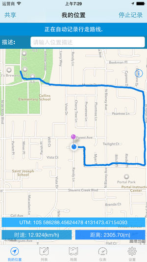 GPS位置记录与共享应用主要功能: 1. 手动记录GPS地理位置经纬度坐标。 2. 自动连续记录GPS地理位置经纬度坐标。 3. 实时显示UTM坐标。 4. 编辑记录位置的名称与描述。 5. 列表浏览记录的所有位置信息。 6. 在地图上标注记录的所有位置信息。 7. 通过邮件导出记录的所有位置信息或者部分记录信息。 8. 支持TXT,CSV,JSON,GPX,KML,XLS与UTM七种记录数据文件格式。 9. 通过短信或者邮件将用户当前所在位置的GPS经纬度信息告诉他人。 10. 将自己的当前所在位置上传到微博,facebook,twitter等。 11. 提供GPS时速表,里程表与海拔表。…