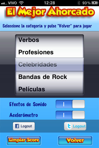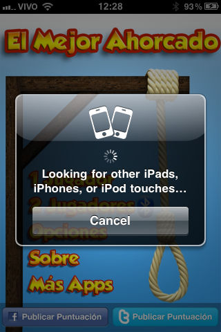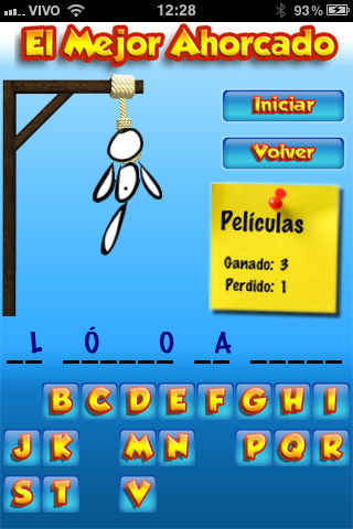 El Mejor Ahorcado is a very popular word guessing game Hangman. It is also an educational application where you can improve your vocabulary. Why this is the best? - Multiplayer mode via Bluetooth - Animation effects the you tap the letters, the buttons, win or lost - Sound effects - A large numbers of words in its database, divided in many categories like movies, celebrities, etc... - The man follows the gravity - No ads or banners The application is in Spanish and was made specially for Spanish speakers. Just tap Start and start tapping the letters to try to discover the selected word. But be careful. If you make too many mistakes the man will be hanged! Your comments and reviews will be considered for future updates. Enjoy! Keywords: hangman, ahorcado, forca, game, word, guess, guessing, spanish, español, mexico, argentina, spain, colombia, chile, venezuela, juego, españa IMPORTANT: Few people has comment they got a message saying it could not be installed in their device because it is not compatible. In this case, just delete the application in iTunes and download it again (Apple will NOT charge you twice by the same app!)