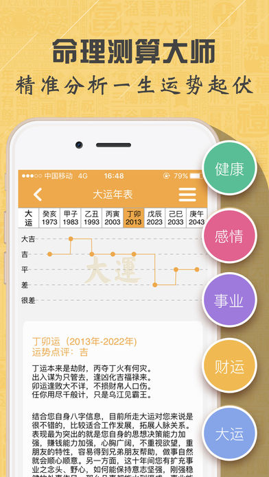 八字测算命理大师,随身查看运势运程。最新2017年运势分析!周易占卜测算,流年财运事业感情走向,最专业八字排盘应用。 最好的八字算命应用!八字排盘是中国人民传统文化的结晶,经历几千年的岁月而沉淀下来的民族精华,具有独特的神奇的未来预测功能。八字排盘提供精准算命,为您通晓未来,让你为接下来的未来做好充分的准备。 【八字排盘】 通过生辰八字组合出你的先天的命局,详细的命盘解说,配合阴阳五行,精准分析你的未来发展趋势,让你把握大运之年,提升事业、爱情、财运等运势。 最新2017年运势分析,提前预测分析你的运程,掌握最新运势走向,为未来提前做准备,让你始终快人一步,准确把握机遇,创造属于你未来。 自己的命运自己掌握,可是如果连自己的命理运势都不知道,你又该如何改变命运呢? 【主要功能】 1、八字算命:国内著名命理老师亲自指导,免费看排盘,周易占卜测算,为您专业提供命理信息; 2、运程分析:大运年表、流年运程为您分析一生运程起伏,流年趋吉避凶。十神、命宫详解让您知晓先天运势、命运的主轴、行运的源头。 3、婚恋配对:看桃花,定姻缘,帮你找到身边的那个TA; 4、命主分析:性格、事业、星座分析全面独到,精确预测您人生的贫贱富贵,让您更了解自己。 5、健康养生:提供专业养生要点,为您调整饮食和生活起居,助您保持健康。 【应用特色】 〖简洁易用〗国内著名命理老师亲自指导,打造最简洁易用的八字组盘解盘命理应用。 〖专业免费〗免费看排盘分析,提供八字干支、十神、五行、大运年等专业命理信息。 〖流年大运]〗大运年表、流年运势等全面分析你的一生运程起伏,让你流年趋吉避凶。 〖命宫详解〗命宫详解让你了解流年运程、知晓先天运势、命运的主轴、行运的源头。 〖分析全面〗事业、婚姻、财运、健康等讲解全面独到,精确预测分析你的人生运势。 〖开运转运〗提供各种开运转运方法,方方面面、随时随地避煞转运,轻松度过难关。 八字排盘流月分析: ¥18/月 订购八字排盘流月分析可以通过itunes账户的信用卡直接付费。如果当前订购周期(一个月)结束前24小时内未取消续订,我们将会自动为您续订下一周期的八字排盘流月分析。在订购有效期内,无法取消。订购成功后,可在“账户设置”中管理自己的订购服务。 【联系我们】 我们始终把用户的心身放在首位 通过以下方式随时关注和联系我们,让我们共同打造专业的命理应用 官方微信:lingjimiaosuan 官方网站:m.linghit.com