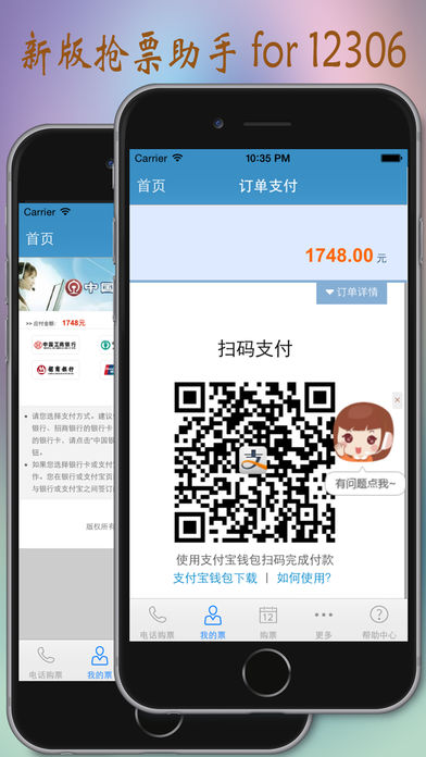 抢票助手 for 12306是一款基于中国铁路客户服务中心网(12306.cn)开发的移动设备客户端工具软件。 为您提供更方便,更快捷,更安全的火车票购买方式,也是您居家生活、驴友旅行、出门探亲、节日回家、欢度蜜月的必备的工具管家。 让您随时随地锁定列车座位号,不用再到火车站售票厅及火车票代售点排长长的购票队伍。 与12306在线购票同步,支持成人票、儿童票、学生票、残军票; 功能描述 ∆∆ 登陆,出于安全考虑,登陆需要输入验证码。 ∆∆ 查询余票,不登陆也可以查询当前余票。 ∆∆ 订票查询余票,登陆后的余票查询。 ∆∆ 订票,支持多人同时订票,在订票页面可以直接从常用联系人中选取订票人,方便、快捷。 ∆∆ 支付,可以通过本软件直接支付。 ∆∆ 订单管理 未完成订单查询、支付、取消,已完成订单查询. ∆∆ 常用联系人管理,添加新联系人。 ∆∆ 电话订票【iPad不支持】。 ∆∆ 常见问题解答。 ∆∆ https验证,整个订票流程无任何第三方平台交互, 直接与12306官网对接全方位保证订票安全。 支付方式: 部分银行手机支付有无法安装控件的问题,经过测试列银行可手机支付:招商银行(手机支付)、建设银行(帐号支付)、支付宝等。 注:工商银行、农业银行、中国银行、中国邮政都无法手机支付,如果本人没有上述可支付银行账号,你同样有45分钟的时间,来通过电脑支付。 抢票技巧 ∆∆ 提前添加常用联系人,购票时无需手动填写,购票快人一步; ∆∆ 随时查询,不时会有新票放出,或乘客退票,即时捡漏。