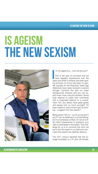 Older Workers Magazine linking mature age job seekers with age friendly employers. Employers looking for reliable, experienced workers can increase their applicant pool by attracting older workers Older Workers $2.99 www.olderworkers.com.au Older Workers Subscription available: A single issue for $5.99 (non-subscription) 1-month subscription for $2.99, automatically renewed until cancelled Payment for all purchases will be charged to your iTunes account at the confirmation of your purchase. SUBSCRIBERS' AUTOMATIC-RENEWAL FEATURE: Your subscription automatically renews unless auto-renew is turned off at least 24-hours before the end of the current period.