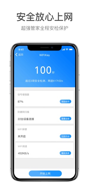 【我们的亮点】 亮点一:全新适配iOS11和iPhoneX; 亮点二:安全上网,365天WiFi管家全程护航; 特点三:专属内容,个性推荐每日资讯。 【产品简介】 WiFi钥匙上线于2012年,致力于为用户提供更好的上网服务,最大限度保护用户上网安全。WiFi钥匙致力为用户提供更加安全的上网环境,接入中科院旗下资金投资,在安全防控体系,保护用户的信息方面更是国内领先,是iPhone手机用户安全连接WiFi的首选神器。 同时我们不断适配iOS系统更新,从iOS8截图扫描,iOS9系统列表扫描,iOS11全新适配,我们一直不断地技术创新,为用户提供最优的体验。