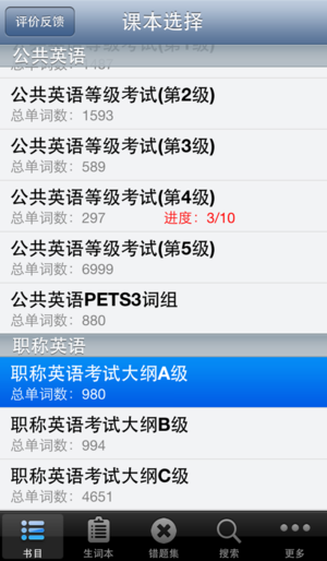包括职称英语考试大纲ABC级以及公共英语等级考试1-5级全部分册词汇。免费离线使用,附有单词发音及详尽解释。 主要功能特点: * 分类清晰,智能分组 * 真人发音,单词资料解释详细 * 自主标记,掌控学习进度 * 分组测试,错题自动记录 * 生词随时收藏,方便查看 * 单词搜索,快速查词