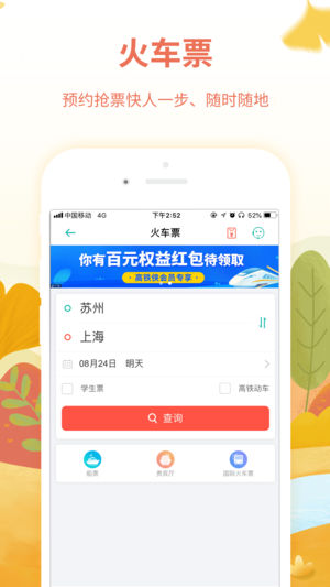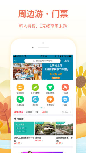 同程旅游移动客户端提供景点门票、酒店、机票、火车票、出境跟团、出境自由行、邮轮、汽车票等旅游产品预订,并提供用车、团购、攻略等全方位旅游服务。 支持在线预订国内110000余家酒店和客栈、国内所有航线、国际大部分主流航线及国内所有铁路线路。提供国内30余家城市在线打车、国内50余家城市机场接送机服务。 度周末,度长假,快乐每一程! 【功能】 1. 景点门票:[有票频道]免费获取景点门票!周周更新免费景点列表!快捷预订,订贵了还可申请赔付,赔付2倍差价,行程有变,随时可退,手机预订优惠更多,点评奖金1元提现; 2. 机票:提供接送机服务!再用不用排队等待!国内所有航线打折机票预订,快捷预…