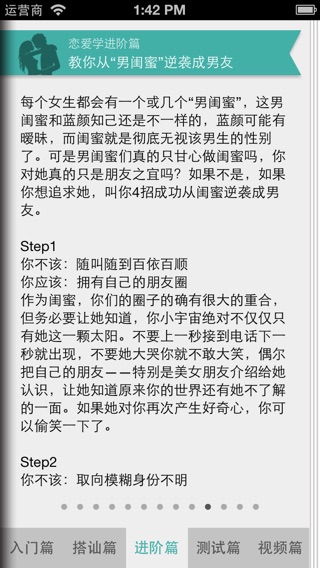 你马上就要学到的这些秘密,是绝大多数男人一辈子都不可能知道的,它们是关于女人以及如何吸引女人的。 我会教你如何让女人情不自禁的爱上你,而且这种爱的产生是她们完全无法控制的! 我用了几年时间去研究那些真正能够吸引到女人的高手,结果,我看到的和学到的东西,是我以前想都不敢想的。 这些东西不需要你有钱,也不需要你帅,也完全不需要你长得高…… 在我学到这些东西以后,我开创了一套全新地、系统地的具体方法,这些方法能够让我自己成功吸引到任何女人! 这个APP将让你变成一个真正的情场杀手!
