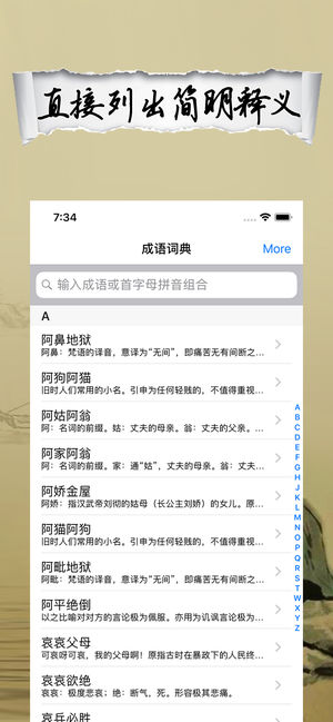 《成语大词典》包含超过50000成语词条,每个词条都有拼音、释义、典故出处以及举例说明等,全面且权威。 《成语大词典》提供快速搜索的功能,并独家支持首字母拼音检索,只需要输入成语中每个汉字拼音的首字母即可检索,非常便捷。 《成语大词典》提供收藏功能。 《成语大词典》完全离线运行,无需联网。 《成语大词典》是学习汉语的必备工具,对于语言研究者也有极大的帮助。