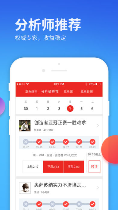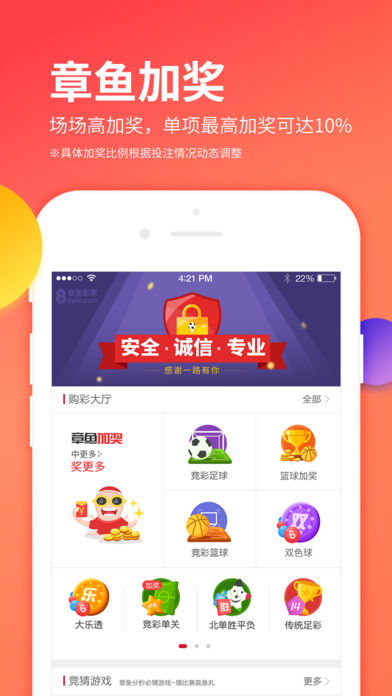 章鱼彩票-知道更多,赢的更多! 足彩彩票,购彩神器!体彩、福彩、竞彩足球、足彩、双色球、大乐透、,各个彩种游戏的专业服务平台,为移动端用户提供专业的彩票资讯、数据分析、购彩技巧研究分析等服务,是为中国彩民量身定制的,安全、优质、高效的移动互联网个性化彩票服务终端,购彩超方便,一键下载。 ——————产品特点—————— 【彩种全面】 热门彩种多个玩法全线覆盖 ●福利彩票:双色球 ●体育彩票:足彩、竞彩、竞彩足球、竞彩篮球、NBA篮球、足球单场、竞彩单关、北京单场、胜负过关、胜负彩、任选九、大乐透 ●竞彩投注:竞彩足球、篮球全部玩法、足球胜平负、让球胜平负、比分、进球数、半全场、混合过关投注、竞彩篮球胜负、让分胜负、大小分、胜分差 【特色功能】 ◆攻略预测:专家每日竞彩推荐预测,包括英超、英冠、英甲,西甲、西乙,德甲、德乙,意甲、意乙,法甲、法乙,荷甲、荷乙,葡超、葡甲,瑞典超,瑞士超,欧冠杯,欧罗巴,中超,日职联、日职乙,亚冠,亚洲杯等热门赛事。 章鱼加奖:独家竞彩足球加奖活动,单关最高加奖15%,2串1最高加奖32%。 章鱼爆料:独家、及时、准确的赛前动态,最有价值的赛前信息参考。 ◆章鱼指数:基于数据模型计算出精准的比赛预测,用于辅助投注 彩红盒:独家2串1投注及奖金优化工具 ◆比分直播:最专业的竞彩、足彩及蓝彩的比分数据分析、赔率 ◆开奖提醒:即时更新彩票开奖公告,彩票开奖号码自动推送通知,第一时间得知彩票中奖消息 ◆竞彩新玩法:竞彩足球单选赔率区间在1.75以上的比赛,3场比赛2串1的过关方式,降低投注风险,也可保证较高奖金回报。 客户服务:周一至周日 9:00~24:00,电话:4007766981 *声明: 本产品仅供达到法定年龄者用以参考,且所有活动与内容跟苹果公司无关。