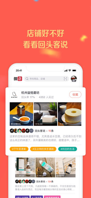 地道私厨、上好食材、精品咖啡、原创设计、脑洞创意、全球海购...尽在微店,上微店逛口碑小店,认识高手店主。 *发现:发现各种回头客推荐的口碑小店,逛到停不下来; *关注:找到中意的小店先关注了,以后他的新品、店主动态都可以随时轻松查看了; *消息:在这里可以和熟悉的店主聊天,管理你的联系人,和更多的人成为朋友; *购物车:送你一辆装满幸福好物的购物车; *我的:为你提供商品、订单、购物车,收藏的店铺等统一管理功能,你收藏的店铺还可以按自己喜欢的分类来整理;