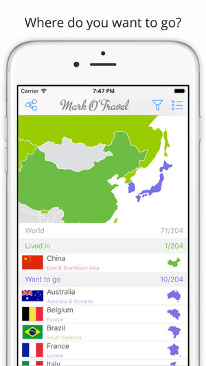 新制作自己的旅行地图,标记已经去过的国家和地区! 软件具有友好的界面和丰富的功能: —可以标记已经去过的国家和地区; —参会者统计; —可以添加照片和旅游攻略; —使用iCloud同步可以在新的设备上恢复数据; —可以通过社交网络分享自己的旅行地图. 研究地图,旅行,提高地理知识水平! 有问题,请发邮件到 iosradetel@gmail.com.