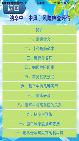脑卒中俗称中风,它对人类的生命健康造成了极大的威胁和损害。世界卫生组织WHO的最新数据表明,全球每6秒钟就有一个人发生脑卒中,其中绝大部分患者因此而致残,如偏瘫、失语、失明等。目前,它已成为我国位居第一的致病死因,发病率是心肌梗死的4~6倍,而且致残率和复发率也非常高,30%的患者在第一次发病的时候就被夺去了生命,这就是被称为我国国民健康头号杀手的脑卒中。根据王陇德院士给出的多国组织的脑卒中MONICA研究结果,我国脑卒中正在以每年近9%的速率上升,在亚太地区,中国脑卒中发生率是最高的,发病死亡率甚至高于欧美等发达国家。WHO对中国脑卒中死亡情况做了预测,如果死亡率维持不变的话,到2030年我国将有近400万人死于脑卒中;如果死亡率有1%的增长,到2030年我们将会有近600万人死于脑卒中。 远离头号杀手 防控最关键 脑卒中筛查与防治是一项重大的国民健康工程,本软件对于脑卒中的预防有重大预防意义测试简单快捷,适合基层卫生保健机构或治未病中心下载使用。