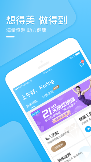 Feel 是一款移动健康应用,更是一种生活哲学。主张每个人都应不断提升自己的健康状况、改善不足与恶习,保持积极健康的生活态度。Feel结合人体健康大数据和人工智能AI算法,并在顶级行业专家的督导与陪伴下,已为超过4500万用户精准定制了50000+种健康管理服务,涵盖十大健康类别,帮您轻松实现健康生活目标。 在Feel,我们可以帮您解决: 减肥瘦身 科学增高 健身塑型 美容护肤 男性、女性私人健康指导 优化心理健康状态 饮食营养调理和治疗服务 慢性病、职业病的管理和治疗 产后的身材和心理等问题的调整和恢复 改善不良的生活习惯 ………. 以上等等一系列困扰您的生活和健…