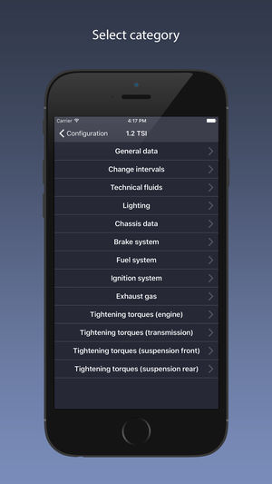 The application contains technical information that will help you in the repair and maintenance of your car. Data is divided into categories: general information, chassis, tightening torques of bolts and nuts, fuel system, brake system, lighting lamps, a replacement intervals and volumes of technica…
