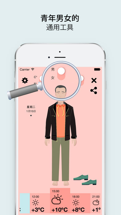 最好的天气运用程序能够显示在地球上任何地方、具体的时间应该穿着什么。 不可或缺的信息为那些谁: - 向朋友通知戶外的天气信息 - 看是晴天,实际上很冷 - 早晨匆忙起床,脑海里浮现着如何着装的方案 - 不知道怎样着装去旅行或出差 - 应该经常考虑男士、女士、男朋友、女朋友应该怎样着装 - 了解时间花在哪里,我们的软件节省时间 需要考虑几点因素: - 温度 - 湿度 - 风力 选择位置的两种方式: - 依靠导航的帮助 - 手工服务 时间指标: - 五天內的气象图 - 三小时间隔 选择人事的可能性: - 男性 - 女性 补充设置: - 二十四时计时与十二时计时法 - 摄氏与华氏温度表盘 优势: - 缺乏类似的软件 - 气象数据的实际应用 - 简单直观的界面 - 简要设计,全部焦点在服装上 - 应用程序总共七兆,不需要占大量内存空间 - 气象数据的可靠性与准确性