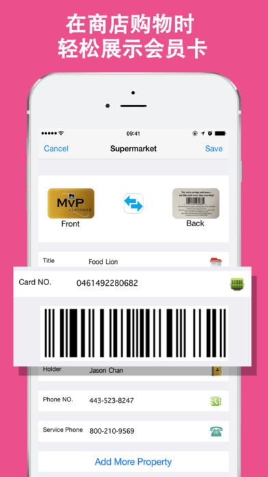 **最安全、最好用、最易操作的会员卡管理软件!** 将你所有的会员卡存储在VipCard. 解放你的钱包,再也不用带着一大堆卡片出门了! VipCard简单易用,你只需要将卡片拍照存入App里面,它将自动生成相应的卡号和条形码。当你在商店购物的时候,只需要拿出手机打开VipCard就可以轻松找到相应的会员卡,将二维码图片展示即可如同塑胶的会员卡一样使用。 ----------------------------------------------- 所有存储在VipCard会员卡管理软件的数据都是100%隐私和安全的。您的所有数据都只会存在您的设备而不会上传到我们的服务器。没有您设置的开锁密码,任何人包括我们都无法获取您的卡片数据! ----------------------------------------------- 使用简单: - 无需注册,下载好打开App就可以直接使用; - App已经为你内设了丰富的模板,方便您有条理的输入卡片信息,同时也支持自定义条目; - 将不同类型的会员卡分类管理,简单易用。 ####主要特性#### * 除了常用的各种会员卡,您还可以存储例如信用卡,名片,护照,身份证,优惠券等信息 * 支持插入记事本备注、图片记录等敏感信息 * 支持自定义各个模块,完美DIY卡片信息 * 隐藏列表:存储您最隐私的账户信息,可该列表设为隐藏,只有自己能看到 * 通过iTunes、WiFi或Dropbox,简单备份和恢复数据 ####安全性能#### * 采用AES-256 bit 军事级加密技术保障数据安全 * 使用软件密码锁功能,只需记住一个主密码解锁软件 * 所有数据均存储于手机本地,你可以将数据备份文件备份至您的电脑或者Dropbox中 * iOS 8 & iOS 9 系统的iPhone 5s之后的手机可以使用Touch ID解锁软件,不用记忆主密码,使用更加便捷 * 软件自带的数据自毁系统,如果您的手机丢失,当其他人输入错误解锁密码达到设定的最大次数时,数据将自动毁灭,最彻底地保护您的数据安全 * 除了你本人以外,其他任何人包括开发者在内都无法获取您的数据信息 今日免费,马上下载! >> 友情反馈: 如果您喜欢本应用,请一定给我们最真诚的评分,您积极的评分和回复,将是我们不断改善应用的动力。 如果您觉得本应用有什么不妥之处或者有什么功能欠缺的,请一定通过下面的邮箱联系我们,不要写在app store的应用评价里面,因为只有这样我们才能够回复您。您在邮件提到的任何问题,我们将非常乐意给您回复! E-mail: estill_hill@hotmail.com