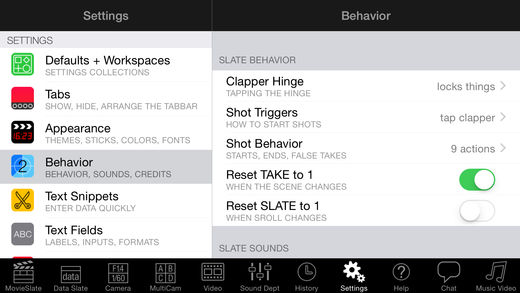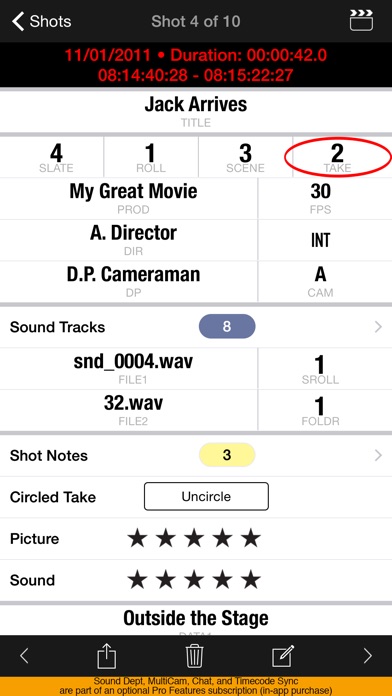 NEW VERSION 8 Built for iOS 9+10 and the latest iOS device screen sizes. Details and Video at movie-slate.com. AS SEEN IN APPLE’S iPAD TV ADS “MovieSlate® is the the Rolls-Royce of slates” says HandHeldHollywood.com. A convenient, all-in-one digital slate, clapper board, shot log, and notepad is used for film, TV, documentaries, music videos, and interviews, this professional production tool is the easy way to log footage and take notes as you shoot— saving you valuable time later when capturing/editing footage, and creating reports. All at a mere fraction of a bulky digital clapperboard’s cost. DIGITAL SLATE Tap a field to edit production info. Choose info from default/custom snippets, contacts, or saved history. Enter new info with the keyboard. Use the optimized keypad to quickly enter numeric info like: roll, scene, take, timecode. Or swipe up/down on fields to increment/decrement numbers. TIMECODE Entering timecode is fast and simple with our optimized keypad. Sync to clock time, or to a song from your iTunes music library (for “Music Video” mode). With optional PRO Features in-app purchase: LTC/WiFi sync with: compatible cameras, recorders, generators, TCS Hubs (:pulse, :wave, :buddy master, Denecke TS-TCB slate); and with other MovieSlate apps. CLAPPER BOARD To begin a shot, photograph the slate’s production info, then tap the clapper sticks. The sticks open and clap closed, creating an audible/visible marker. All slate data is logged to history. Optional credits animations briefly display each production field, full screen. SHOT MARKER/NOTES, VOICE/IMAGE NOTES For each shot, you can: circle a take; rate sound/picture quality; write multiple shot notes; record voice notes; take picture notes. Example: when shooting interviews you can create notes to timecode-mark when a particular question was asked, or something remarkable was said. Enter notes using the microphone, camera, keyboard— or insert snippet phrases (such as “Interview”, “Question”, or “Tail Sticks”). SHOT LOG HISTORY Get fast, searchable access to shot info, without wading through hours of footage. For each shot: all production, GPS location, and timecode data is stored to the app’s Shot Log History, where you can view, edit, or rate shots. History/Notes can be exported/emailed as: HTML, XML, CSV, and TAB formats. Supports multiple projects. HAVE IT YOUR WAY Customize MovieSlate’s behavior and appearance to suit your workflow and tastes. Choose layouts, behaviors, sounds, and themes (clapper/hinge designs, backgrounds, fonts, and colors)— even display your production logo on the slate and in reports. READY WHEN YOU ARE With MovieSlate on your iOS device: lost clapper boards will be a thing of the past. Your shot history is always ready to view, review, edit, or send. SLATE FEATURES • Landscape/Portrait (lockable) • Standard FPS rates • Customize behavior, layout, appearance, sounds • Detects external claps (using compatible cases) • Color/Gray/Focus charts • Credits animations PRO FEATURES (in-app purchase: $9.99/month or $299.99 one-time) • Timecode Sync - with compatible gear via WiFi/headphone jack. • Denecke TS-TCB - sync claps/timecode/data. • Sound Dept - data/notes logging/reports for up to 32 tracks. • Sound Recorder Sync - with Sound Devices 6-Series. • Reality MultiCam - data/notes logging/reports for up to 26 cameras. • Camera Sync - with ARRI + RED cameras. • MovieSlate Cloud Pro - advanced backup/restore/sharing. • App-to-App - sync and remote control. SCRIPT DEPT SUBSCRIPTION (in-app purchase: $24.99/month) • Includes Script Dept features and all Pro Features SUBSCRIPTION DETAILS • Listed prices are in $USD • Subscriptions are monthly, and auto-renew • Purchase & Renewal details - movie-slate.com/Subscriptions REQUIRES: iOS 9 OR NEWER. RUNS ON: IPAD2 OR NEWER; IPHONE4S OR NEWER; IPOD TOUCH 5 OR NEWER.