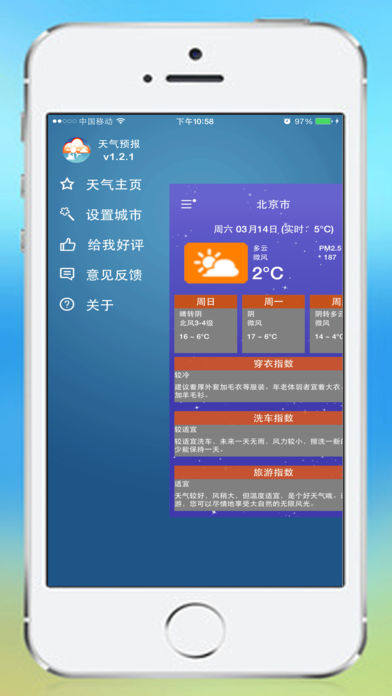 【产品简介】 包含全国3000多个城市天气信息,采用国内外多家气象机构数据,天气信息权威、准确、全面。提供信息全面24小时预报、精准的未来3天预报。空气质量、污染指数、温度趋势、PM2.5 等更加丰富、精准天气信息!提供穿衣、洗车、紫外线、感冒、运动、旅游等生活指数,是您日常生活、出行旅游的必备APP! 【特色功能】 1.语音播报:甜美女声为您播报当前天气。 2.选择城市:独创的通过地图拖动选择城市功能,自动定位城市。 3.周边天气:调用附近地图,真实坐标查阅当前城市天气。 4.生活指数:提供穿衣、洗车、紫外线、感冒、运动、旅游等生活指数。 5.分享天气:随时通过微信或微博分享天气信息。 6.当有恶劣天气将要来时,我们将提前推送通知提醒您。 【官方微信】 关注微信公众账号: 报天气 (weather-report) 【官方微博】 http://weibo.com/weathereport