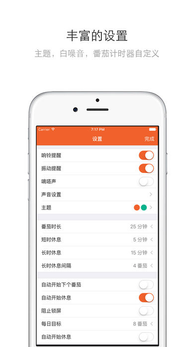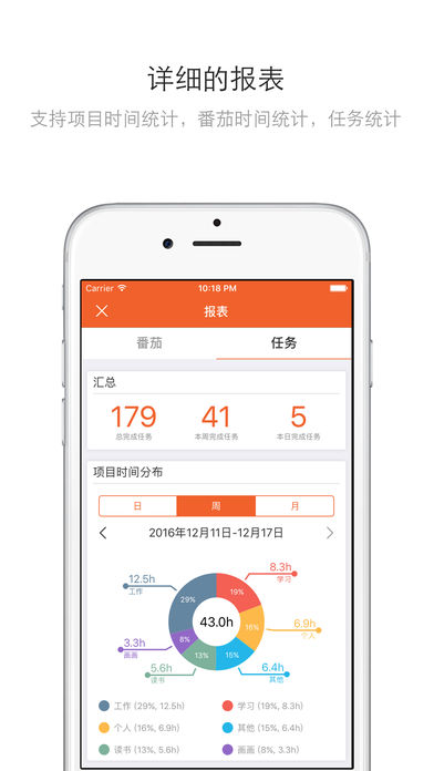 ####中国效率榜排行榜前5 ####疯狂番茄,番茄工作法结合任务管理,为专注工作和学习而设计,告别拖延症! 主要功能: - 番茄工作法: 支持番茄的开始,休息,暂停,停止操作 支持番茄时间,长/短时休息的时间自定义,长时休息的间隔自定义 支持自定义是否自动开始下个番茄,支持自定义是否自动开始休息 - 任务: 支持任务安排 支持项目管理 支持提醒,重复功能 支持任务预计番茄数设置 - 报表: 支持番茄使用时间和番茄数量统计 支持今天/近7天的番茄时间的分布甘特图的展示 支持日/周/月三个维度的执行番茄数的趋势图展示 支持完成任务数量统计 支持项目时间分布统计 支持日/周/月三个维度的完成任务数量的趋势图展示 - 多平台同步: 支持iPhone,iPad,Apple Watch, Mac的数据同步 - Apple Watch支持 - 丰富的提醒: 支持番茄完成/休息结束铃声、振动提醒 多样铃声可选 多样工作的白噪音可选,助你沉浸在工作中 - 多样主题界面: 提供多样清新主题 界面圆形番茄籽提示番茄执行进度 - 3D Touch支持 - 支持阻止锁屏
