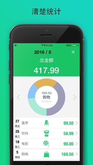 SpendNext - 明明白白消费,随时随地记账。 SpendNext以 " 每月预算 " 的方式帮助自己分析,并控制自己的消费,最终达到省钱的目的。 对自己的个人财务和消费情况有更详细的了解,让自己的消费变得更聪明。 •••••••••主要特点••••••••• - 简单、易用、只需2秒、养成习惯 - 预算模式,控制花费 - 能看到自己每一天花费了多少钱,每个月还有多少钱可以花费 - 创建和管理自己的类别,提供丰富的类别图标 - 统一管理单个类别的所有交易记录 - 一键分享交易数据给家人、爱人、朋友等 - 每月汇总统计图表 - 选择日期范围的数据导出CSV - 密码保护自己的消…