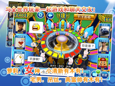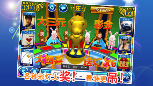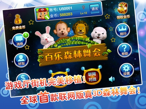 ▲▲游戏厅最刺激最火爆的森林舞会游戏登陆iOS平台▲▲ ▲▲100%街机完美移植!3D画面震撼您的双眼!▲▲ 本游戏是游戏厅很受欢迎的游戏!现在您可以随时随地和各路高手一起游戏,用您的胆略和智慧驰骋江湖! 游戏特色: ▲ 街机完美移植 完美移植游戏厅街机,画面高清,音乐震撼,让您随时随地体验街机刺激感觉 ▲ 免费金币天天送 登录即有金币赠送,在线即可领取免费金币!让您玩就玩个够! ▲ 支持联网对战 游戏中支持单机练手,也可多人联网对战! ▲ 经典玩法,应有尽有 囊括狮子机所有经典玩法,押动物,押灯,还有庄和闲,找回难忘的乐趣! ▲ 游戏大奖,一个都不少 彩金、闪电、送灯、大三元、大四喜各种大奖等你来拿! 游戏玩法: 1. 进入游戏后选择分区,游戏设有新手区、初级区、中级区和高级区,不同区有不同的押分限制和彩金倍率,选择分区后再选择房间; 2. 动物押注:游戏中有狮子、熊猫、猴子、兔子4种动物,每种动物分红色、绿色、黄色3种颜色,共12门动物押注,倍率可变,一局可以押部分或者全部押注; 3. 庄和闲押注: 庄、和、闲3门倍率分别为2、7、2,一局可以押部分或者全部押注; 游戏规则和街机厅规则完全一致! 通过本游戏可以提高您的玩机技术! 游戏交流: ▲客服QQ: 3303527347