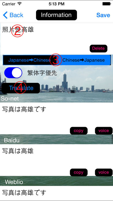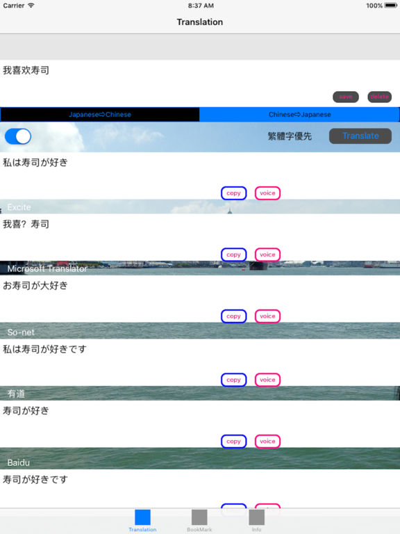 ----台湾的付费参考部门首位得了--- **请用通信状态在好的地方** .这是一个中日翻译APP .同樣的單字和句子,在不同網頁翻譯下皆有所不同,請選擇翻譯較恰當的來解讀 ·对应简体字,繁体字 ·文本的一揽子消去 ·长按纪录则可删除 ·轻轻点击记录就可重新翻译 .此翻译APP可以帮助正在学习中文和日文的学习人员 ·请与与旅行,海外的朋友的联络供学习,工作使用。 .这两个都是文字转语音的app ·此应用程式可以朗读翻译后的文章。 若有问题请发邮件或发信息至支持页面咨询。 Support Page https://www.facebook.com/Translation.application.series/info *********************************************************** Load会花费一些时间,Load结束后,再输入需要翻译的文句 缩减部分翻译网站,减少等待读取时间 ***********************************************************
