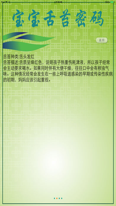在传统的中医诊法中,舌诊占有十分重要的地位,特别是舌与脾胃的相关性历来引起众多医家的兴趣和关注。在2000多年前的《黄帝内经》中,舌与脾胃的关系就有了详尽的记载:“脾足太阴之脉,入腹属脾络胃,上膈,挟咽,连舌本,散舌下。”“脾气通于口,脾合则口能知五谷矣。上焦出于胃上口⋯⋯上至舌,下注足阳明。”在中医学数千年的发展史中,舌与脾胃的相关性逐步达到了客观化、形象化的程度。如章虚谷所言:“舌苔由胃中生气所现⋯⋯胃中之生如地上之微草也,若不毛之地,则土无生气矣。”又如吴坤安所说:“舌之苔,胃蒸脾湿上潮而生,故曰苔。”总之前贤多认为五脏皆禀气于胃,苔为胃气所熏蒸,故脾胃病的舌像变化最突出,有舌为脾的外候之说。 宝宝身体的细微变化,都能从小舌头上反映出来。舌苔就是孩子健康情况的“晴雨表”。健康孩子的舌头应该是舌体柔软,伸缩活动自如,大小适中,舌面有干湿适中的薄苔,颜色淡红且口内无异味,即“淡红舌,薄苔”。怎样辨别舌苔异常,舌苔异常代表了什么,如何对症“下药”,都是妈妈们应该了解的。宝宝去医院看病时医生也总爱看宝宝的舌苔。其实宝宝舌苔的颜色、形状、厚薄其实都是宝宝健康的一面镜子。 本软件利用最先进的影像识别技术,通过手机摄像头拍摄舌苔的照片,分析舌苔颜色的比值,自动判断出舌苔的状态,是妈妈们了解、学习观察宝宝身体健康状态的镜子!