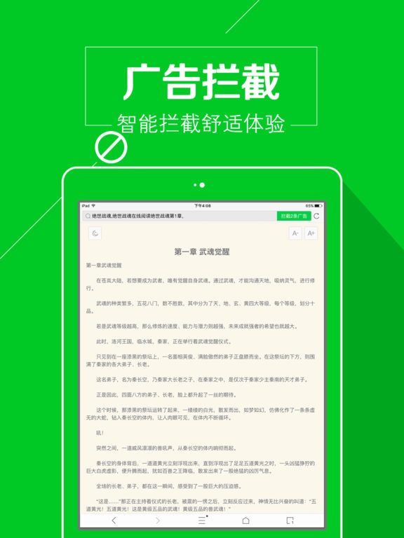 绿色浏览器是一款针对iPad,iPhone用户精心研发的无广告安全极速上网浏览器。 【产品特点】 告别烦人的弹窗广告,网页广告 浏览速度快、启动快 节省广告请求流量,真正的绿色省流量,IPAD装机必备! 我们还为您精选了最适合iPad,iPhone浏览的中文网站,让您随时随地关注包括新闻、小说、视频、购物、微博、娱乐、财经、社区、交友、团购、汽车等各类网站 还等神马,赶快下载吧!!! 免责声明:如您发现有极少数广告没有屏蔽,请在意见反馈中提交网址,谢谢!