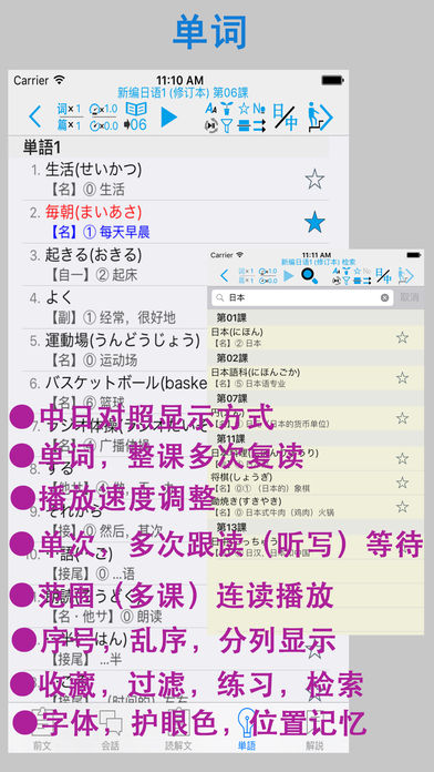 本APP参照《新编日语(修改本) 第一册》制作而成。包含了1〜20课的前文,会话,读解文,单词和语法等5大部分。全部的课文和生词都配有真人的发声。您可以通过手机和平板进行下载。方便任何有需要的朋友方便快捷的学习,能够快速强化您的听,说,读,写能力。本APP集成了超强的复读功能,可以根据自己的需要对每个单词、每句话或者整篇内容进行一遍或多遍的复读,洗脑式的复读可以加强记忆。同时,您还可以在“设置”里进行设置后台播放,方便您在移动中使用。 (注:如果您有任何购买问题咨询或意见反馈,可通过新浪微博:橙汁APP,或微信chengzhiapp 和我们取得联系) 语音复读模块: 在会话,课文和单词部分中,除了手工点击可以播放外,还集成了超强的复读功能。具体包括: ① 通过词[句]([词])按钮【左2】 调整 一句话/单词 的 单次复读次数(最大为99次)。 ② 在①的功能基础上,还可以通过[篇]按钮【左3】来调整整篇的复读次数(最大99次)。 在和①的功能组合使用的时候,一句话/一个词 最大可以复听(99x99)次。 ③ [音速]按钮【左4】用来调节发音的速度(0.5~2.0),帮助您找到适合自己的语速。逐渐的加强听力。 用来调节发音后的等待时间,(0.1~10),您可以在设置中设置适合自己的默认发声的速度。) ④ [等待]按钮【左5】置适合自己的默认发声的速度。)使用该功能可以方便您进行听写和跟随朗读。同时该功能也配合[句,词]功能进行多次跟读。 (您可以在设置中设置等待时间的单位(单词发音长度单位或时间秒单位)。) ⑤[范围]按钮【左6】用来调节复读的范围,通过该功能可以实现多课连续朗读。该功能可和上述①、②、③的功能同时使用,让您最大限度的使用复读功能。连课范围是:进入的课开始,选择的连课结束。例如:复读3-16课:第3课进入,选择16,点击播放即可。 ⑥ 如果在设置中打开后台播放功能(默认打开),就可以让您设置的复读声音进行后台播放。您可以通过耳机的线控进行停止/继续,在有在连课的时候,更能通过线控进行切课。(单击2次换下一课,单击3次换前一课,单击一次播放/暂停。) ⑦ 按钮 [▶]/[■]【左7】进入复读开始/停止。 课文,会话: ①为方便初学者,本APP为文章中的每个汉字加上了注音,您可以通过[ひらかな]按钮进行显示或隐藏的切换。 ② 显示切换:您根据自己的需求,通过工具栏上的[中/日/中日]的按钮进行中文或日文的显示/隐藏的切换。 单词部分: ① 显示切换:您根据自己的需求,通过工具栏上的[中/日/中日]的按钮进行中文或日文的显示/隐藏的切换。 ② 收藏模块:您可以通过每个单词右边的[星号]按钮,对单词进行收藏。并通过顶部的[星号]按钮,对收藏的单词进行过滤显示。 ③序号显示:可通序号显示按钮进行序号显示临时切换。 ④分列显示:更改屏幕的单词显示方式(上下显示,左右显示)。 ⑤乱序显示:更改屏幕单词的显示顺序。(支持复读) ⑥单词过滤:通过过滤按钮可以进行显示范围的调整。 ⑦练习模块:通过顶部的[练习]按钮,您可以切换到单词的练习模块。本APP集成了“中文->日文”、”日文->中文“、”中文->语音”,“听说比对” ,“单词拼写”等(以下)五个练习模块。(※ 1,※ 2,※ 3) a. “中文->日文”练习:根据中文内容选择相应的日文。 b. “日文->中文”练习:根据日文内容选择相应的中文。 c. “语音->中文”练习:根据听到的声音选择相应的中文。 d. “听说比对” 练习:通过录音,及回放比对您的发音和标准发音。 e. “单词拼写” 练习:通过提示的中文,通过键盘(kana或罗马字)拼写出假名。 ※1 练习模块可和收藏模块进行配合时,可对自己选定(收藏)的单词进行练习。 ※2 练习模块可和范围模块进行配合时,可对特定范围进行练习(例如:第一课进去,选择连课16课的时候,练习范围就是1-16课的单词)。 ※3 练习模块可同时配合收藏,连课2个模块一起使用。 语法解释: 收纳了课本中的语法解释部分的所有语法及例句。 五十音图: 包含了日文字母,清音,浊音,拗音的平假名 ,片假名,罗马字及其相对性的发音。 其他: ◎你可以通过左右滑动进行切换课(向左滑动上一课,向右滑动 下一课) ◎在设置中您可以设定使用后台播放(默认) ◎在设置中您可以设定默认的语音速度 ◎在设置中您可以设定后台播放时定时关闭的时间 ◎在文法界面,右上角有一键打开全部文法的按钮 本APP采用iphone,ipad的双版本设计,一次购买,可在iphone,ipad上同时使用。 APP 中的大量内容,是作者手工录入的,如果您发现不对的地方,望在APP里的意见反馈中联系我们,我们会在定期的版本更新中,修正您提出的问题。谢谢。 如果您喜欢这款app,请赠予评价,将是对我最大的鼓励,您的好评会让我更有动力将这款app做到最简洁,最方便,最实用!! 注1:本APP不含有内购和广告。 注2:本APP不是电子版的教科书,是一款配合教科书的学习用的APP,我们侧重了学习语言最重要的2个部分-听力及其单词记忆,为此我们开发了这款带有超强复读的APP,并对单词部分提供多种练习。 注3:如需想对APP进行功能试用,请下载,新编日语体验APP。