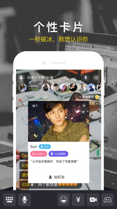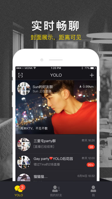 YOLO,全球同志实时视频社交 YOLO基于尊重用户隐私的原则,给你更私密的交友空间。在这里可以根据自身的喜好加入各色的群组,也可以开启“对面”功能,实时交友。 【功能介绍】 1. 随机匹配视频交友,去发现你“对面”的未知,谱写故事 2. 真心话,拒绝尬聊,一秒破冰,海量题库等你来战 3. 私密群组,建立免费或者收费群来筛选你的好友 4. 更多互动,直播、打赏、游戏,找好友随时随地都有的聊