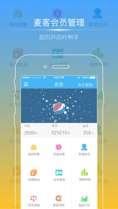 麦客:一款可随时随地掌控您会员、店员情况的会员管理系统 功能介绍: 1、移动互联网云端平台,老板无需到达现场,实时掌握销售动态,了如指掌。 2、服务中小微企业、门店、连锁类药店、超市、卖场等传统实体经济,利用互联网大数据思维改造传统经济。 3、可以实现商品管理,一次性录入现有商品,销售千变万化,随时添加商品目录。 4、可以实现库存管理,利用云端数据计算功能,变以往月月盘库为一次性盘库,化繁为简,大大节省人力物力。 5、可以实现会员管理,会员储值、会员折扣等情况实现动态显示,动态增减,实时短信告知,一目了能。 6、可以实现微营销功能,便捷管理页面,简单方便的公众号管理后台,利用粉丝经济实现销售跃升。 7、简便生成二维码,打通了微支付和支付宝支付,利用互联网金融简单快捷实现交割,满足消费之诉求并大大提升消费者感知。