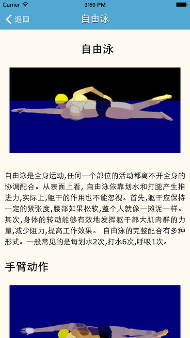 游泳是一项需要较高技巧的体育运动,初学者在学习过程中会遇到很多障碍。本应用汇集了蛙泳、自由泳、 仰泳、蝶泳等基本泳姿的学习方法,采取图文并茂的方式把泳姿的学习呈现在用户面前。 还详细整理了在入水前所要进行的准备,是你学习游泳的必备应用。 特点: 1. 帮你快速学会正确的游泳技术 2. 3D动画详解四种泳姿 3. 各种泳姿都有详细的教学视频 还在犹豫什么,这么一款优秀的游泳教学软件,正准备学游泳的您还不赶紧下载下来?