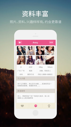 同城约会——超过2600万单身男女在此相遇,轻松邂逅同城有情人。 网易公司最靠谱的约会平台,不要摸不着的异地恋! 近在身边的陪伴才是最长久的! 应用特色 【同城】提供身边最靠谱的单身会员,在同一个城市邂逅美好 【约会】约会才是真正了解一个人的最好方式 【互通】电脑网站和手机APP让你随时随地找到缘分 【真实】一眼看尽会员生活相册,百分百真实会员轻松挑选 【表情】丰富聊天表情助你传达心意,浪漫告白不费心 网易"同城约会"是面向都市高素质单身男女的交友应用,与千万优质会员线上畅聊线下约会见面,手机交友也能浪漫又安全!