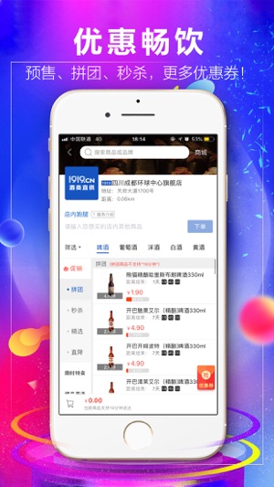 1919快喝——1919酒类直供旗下酒类平台级APP,汇聚全球品牌,精选万款美酒!全国下单支持最快19分钟送达! 【特色功能】 1、立即送:根据用户定位或收货地址,安排附近门店就近配送,最快19分钟送达 2、预约/自提:根据用户实际需要,支持在线预约时间配送、支持在线自选门店到店自提 3、精品严选:大牌甄选、名庄精选、精酿推荐、收藏级必选 4、定制酒:提供酒瓶、酒盒等个性化定制,满足送礼、纪念、节庆、婚庆、升学等需求 5、侍酒师:高颜值专业人士提供餐酒搭配、餐酒推荐预定、侍酒、讲酒等专业服务 更多精彩内容,期待您亲自体验!