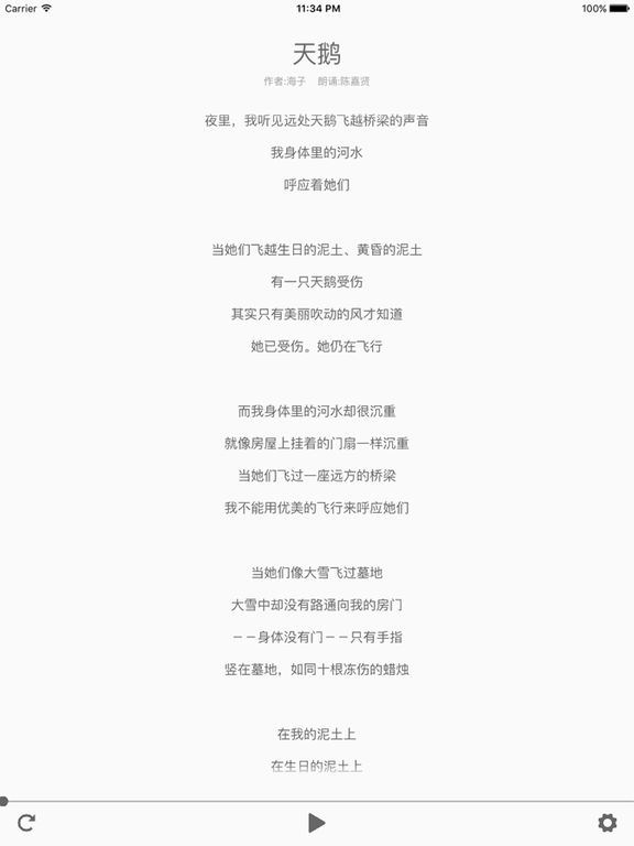 「青年读诗」2.0 正式上线 1.页面全新改版,简洁清新 2.修复了之前存在的 bug 「青年读诗」是一个专门用来阅读诗歌的应用 每天一首最适合年轻人读的诗歌:关于梦想,关于爱情,关于穿越世界的旅行... 每天一个有趣的年轻人为你读诗:乐队成员,环游世界的他,开一家咖啡店的她…... 这就是青年读诗的全部理想。 我们并不想要让大家都爱上诗歌,而仅仅想要尽量减少年轻的我们对诗歌的误解,慢慢地尝试接触诗歌的美好。因为你来人间一趟,总得见见太阳,读读诗,享受片刻的宁静和触动; 与此同时,我们这群95后出生的年轻人,更想要倡导一种诗意的生活,并尝试用自己的力量让更多有着共同信念的年轻人参与进来。他们热爱生命,他们相信生活不止眼前的苟且,他们想要过独一无二的人生并正努力奋斗着——而你也同样如此。 王小波说过,「一个人仅仅拥有此生此世是不够的,他还应该有诗意的世界。」 常常有人说,诗歌已死。可当世界放大镜头,满地都是渴望的青春的我们。无论我们读不读诗,总有那么一刻,内心里有一股说不清道不明,却异常发亮的信念,渴望改变,渴望爱情,渴望看看世界——那就是我们每个年轻人对诗意的向往。 我们希望,青年读诗能够陪伴你走过这段青春岁月,去过电影一样的生活。 诗歌不死,理想不灭。