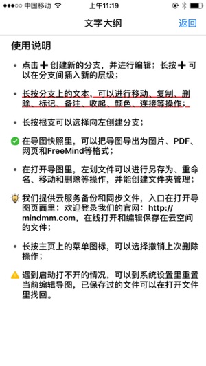 思维导图(MindLine)秉承极简设计的原则,没有繁琐的操作和复杂的界面,在这里你可以轻松构思和扩展想法和计划。 点击分支上的+号,即可向左右两边扩展分支,长按分支上的文本会弹出功能菜单,可以进行复制、剪切、删除、备注和标记等操作。制作好的导图可以导出为图片、PDF和Html等多种格式,并能随时随地分享给好友。 我们还提供了强大的云服务备份和同步导图文件,实现不同设备上文件共享,并确保文件不会丢失。登录我们的官网可以在线打开和编辑保存在云空间的导图。 官方网址:www.mindline.cn 联系邮箱:mindline@126.com 微信公众号:mindlines