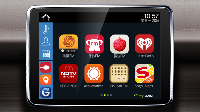 mySPIN是跨平台的手机和车机互联方案,通过USB连接,在为爱机充电的同时,让车主在车内安全地使用手机上的APP。通过将手机APP投射到车机屏上,mySPIN支持如下特性: 1.利用车机完成人机交互,手机负责运行APP和连接网络; 2.提供车规级别的APP UI; 3.所有互联网体验和记录无缝接入到车里,无需重复登录账号; 4.完善的APP生态,覆盖5大APP类别:导航、音乐、信息查询、语音助手、养成用车O2O。 5.高度兼容,全球第一款跨IOS安卓智能互联系统。