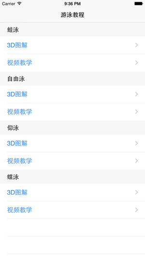 游泳教程离线保存了蛙泳,仰泳,蝶泳,自由泳的3D动画文字说明,还有高清教学视频。 每套教学视频时长均达50分钟,详细介绍了动作拆解、错误动作示范、注意事项、儿童标准动作示范、成人标准动作示范,只要用心看,好好练,一定能快速学会游泳。
