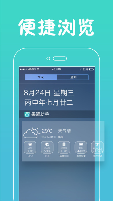 全新果罐3.0,2015年度最佳创意产品,受邀北京电视台BTV采访。 新ICON、新UI、新体验,致力打造全新便捷的理念却不曾变! 独家原创皮肤,这个秋天,晒出你的不一样! 在通知中心添加果罐,用快启和助手召唤神龙吧! ===果罐助手=== 实测网速:抢红包拼的是网速,不要老是怪“手慢无” 剩余电量:当前电量预估可用时长,不要动不动就玩儿“失踪” 磁盘空间:一目了然剩余空间,果罐,这个贴心的小管家,教你如何优化手机空间 ===果罐快启=== 快捷开关:蜂窝数据、低电量模式……… 一键支付:支付宝扫码、付款码……… 一键拨打:老爸、老妈、亲爱哒,快快接通我电话 再说一遍,原创个性皮肤,让小编心水的不能在心水了,这次是真的手慢无噢!!! 再说一遍,原创个性皮肤,让小编心水的不能在心水了,这次是真的手慢无噢!!! 再说一遍,原创个性皮肤,让小编心水的不能在心水了,这次是真的手慢无噢!!! 欢迎加入“果罐”:更多精彩模块,在这里等你“发现” 粉丝QQ群:432648637 官方网址:http://www.at321.com/gw/index.html 官方微信账号:guoguan-dy 官方微博:http://weibo.com/5698295280/profile?rightmod=1&wvr=6&mod=personnumber