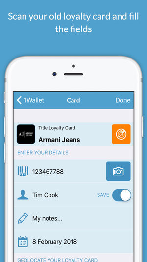 1Wallet allows you to free space from your wallet by converting your paper loyalty cards and tickets to brand new digital loyalty cards compatible with Apple Wallet® for your iPhone®, iPod touch® and Apple Watch®. Now you can save all your loyalty cards in your Apple Wallet® in a very few steps: -…