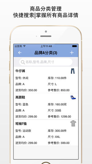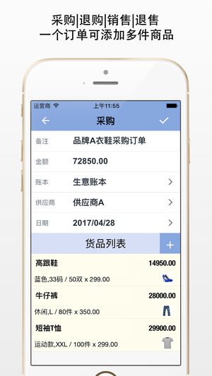 服装鞋帽进销存 (ClothingStore) 正是你需要的,中小商户的业务财务一体化管理,生意管理,手机搞定。 把生意装进手机里,随时随地管账、管货、管供应商与客户、管店铺!全面支持各行业的生意门店需求,让做生意更简单,高效省心。让你做到库存账目清晰,销售利润明晰;软件简单易用,让你轻松管理店铺。 ClothingStore 优点 ==================================================== - 一次购买,终身免费升级。 - 业务数据保密性高,且无二次费用。 - 业务数据可电脑或电子邮件,安全方便。 - 经营者需要关注的主要业务财务数据,一目了…