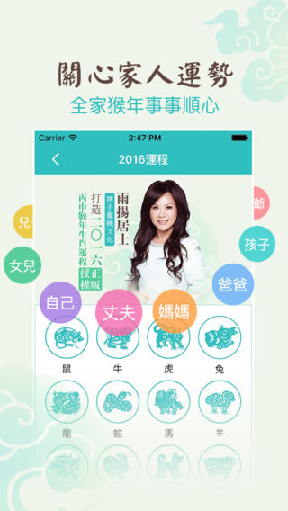 2016年生肖运程开运宝典强势来袭!! 资深媒体命理大师雨扬居士倾力指导!!! 【应用特色】 1、整体运程:2016整体运势如何?透过吉凶星位,预知先机,趋吉避凶行大运! 2、运程详解:猴年运程详细解析,事业、财运、健康、爱情运势,一目了然! 3、流月分析:大师指导每月运程,助您猴年顺风顺水、事事顺心! 4、生肖运势:十二生肖面面俱到,2016好运必备指南! 【大师介绍】 雨扬居士:第一位将命理与科技结合的命理大师,第一位与台湾雅虎奇摩合作大师亲算,专业命理学家,中医学博士,现任雨扬慈善基金会创办人、雨扬科技事业群执行长、台北市云林同乡会理事。一生研究儒佛道文化思想,精通八字、阳宅风水、易经卜卦等中国传统学说,目前已累积五十余本着作。近年来更投身慈善公益与弘扬佛法,帮助人们脱离痛苦、走出迷津,进而知命、造命,转换成正面能量,实现开心即是开运的人生,曾登上日本杂志封面,被誉为幸福领航者。 【雨扬居士2016生肖运程】是雨扬居士与灵机文化强强合作的2016开运宝典,除了有传统的生肖运程详解之外,还增加了由雨扬居士总结多年经验,并经过改良的独家特色开运方法,助您2016年在财运、事业、爱情等诸多方面行大运、行好运! 【品牌支持】 灵机文化是全球知名的传统文化整合传播平台,与上百位知名的命理老师合作,致力于为大家提供更加精准的命理知识和命理应用。 【联系我们】 網 站:http://m.linghit.com/ 新浪微博:灵机妙算 Facebook: https://www.facebook.com/linghit 网易博客:http://gzding.blog.163.com/ 微 信:灵机妙算lingjimiaosuan