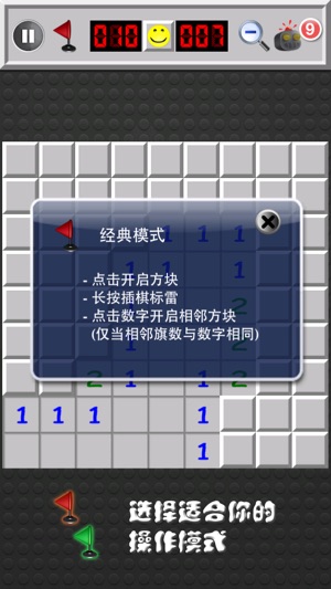 俗话说:上天打飞机,下地扫地雷!今天你扫了没有? 历史上玩的人最多的游戏,现在登陆iOS了,用你的手指头继续刷新纪录吧。不要忘记挑战你微信,微博,Facebook,Twitter,短信,email里的好友哦! 规则 ================ 啥?扫雷都没玩过?火星上还好吧?基本规则是你打开一块砖,下面要么是空的,要么是数字,要么是雷。是雷你就…大侠重来吧。是数字就表示周围还有多少雷。根据这些信息继续开砖。全部没雷的砖打开后就赢了。简单吧?那么开始冲排行版吧!小声告诉你,据说全球前100名都是智商超150的。 怎么控制 ==================== 经典模式: - 点击…