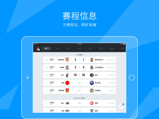 史上最好用的体育iPad产品来了! 腾讯体育HD,掌握最全面的赛事直播资源,提供最方便的赛程查询服务,还有最详细最实时的数据排行,打造看比赛直播与体育视频最好用的体育类iPad客户端。 * NBA全网独家直播及完整回放与视频集锦,1080p蓝光清晰度完美呈现!更有英文原音解说还原比赛现场氛围,给你最完美的观赛体验! * 中超、英超、欧冠、亚冠、CBA、西甲、意甲、德甲、法甲、NFL、F1、澳网、电子竞技、欧洲杯、美洲杯、奥运……全方位比赛类型,24小时经典比赛随时随地让你high起来~ *最完善快捷的图文直播,最迅速准确的实时比分、技术统计、赛季排名,还有实时观赛提醒,精彩赛事绝不错过! * 最优质的金牌解说只在腾讯体育:柯凡、王猛、苏群、马健、刘家超、孟晓琦、杨毅、李楠、李可……更有小姨妈等美女主播搭配精彩解说陪你看球! 除此之外,我们还有世界顶级的转播技术和团队,英文原音、多角度、VR虚拟技术,轻松满足球迷各种需求,只要你网速足够,我们绝对不卡! 别犹豫了,加入我们,腾讯体育,你值得拥有! 让我们一起High翻足篮,放肆吼出来! 更多精彩内容等待你的发现!