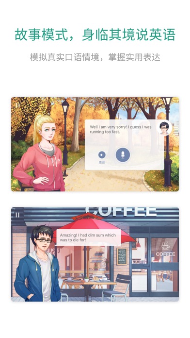 独一无二的动漫式口语学习模式: 优秀游戏原画师制作的人物和场景图,采集自多伦多国际机场以及美国机场入境处的实景环境音,让你身临其境互动式学习,还可以欣赏自己的配音作品,不断改进提高,轻松掌握实用表达。 课程内容: 雅思口语、生存口语、OMG美语、商务礼节英语。不管你学的是中考英语、高考英语还是大学英语四六级,不管你在备考雅思、托福还是立志提升职场英语能力,都能找到适合自己的课程。应试、旅游、交流……真实情境,掌握地道英语口语。 不止于说: 英语口语、单词、语法和听力全面提升是扇贝口语的独到之处。拒绝单一跟读模式。提前预习重点词汇,事半功倍。跟读模仿阶段智能打分,纠正发音错误。提供逐句中文翻译。听音复述,不给文本,完全凭借记忆(对,就是要虐)。还可以将你的发音分享给朋友,学习路上不孤单。 备考雅思: 模块化的主题设计,精选雅思口语考试高频题,邀请 native speakers 撰写内容,驯化舌头,地道表达、精彩词汇脱口而出。 学英语口语,在扇贝: 坚持扇贝一贯的优秀品质,学习进程中的每个生词都可以即时添加到自己的学习计划中,利用扇贝强大的记忆系统进行学习。友善的小组社区,让你在英语学习的路上不再孤军奋战。通过打卡让你坚持,有千万的小伙伴都做到了用扇贝坚持学英语。 也许你会突然发现,开口说英语是一件这么上瘾的事情。 如需帮助,请致信help@shanbay.com 欢迎微博关注@扇贝网,微信订阅shanbay17,和扇贝君做朋友~