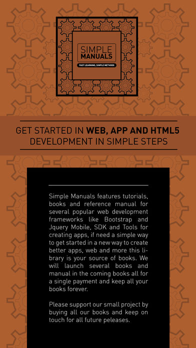 Simple Manuals features tutorials, books and reference manuals for several popular web development frameworks like Bootstrap and Jquery Mobile, SDKs and Tools for creating apps and all the reference tools in a convenient portable format for your iPhone or iPad, if need a simple way to get started in a new way to create better apps, web and more this library is your source of books. We will launch several books and manual in the coming books all for a single payment and keep all your books forever. Please support our small project by buying all our books and keep on touch for all future peleases. Simple Manuals contiene y contendrá cientos de tutoriales para usar las herramientas mas populares de web, de multimedia y de creación de HTML5, tales como Bootstrap y Jquery Mobile. Usando nuestro método de enseñanza exclusivo paso a paso, operaciones complejas resultan realmente simples. Por un pago unico tendran acceso a todos los tutoriales que seran publicados en esta App y pronto tendremos más al alcance de su mano.