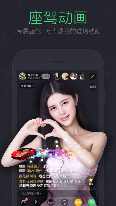 一个真正唱歌的直播平台 【唱歌最好听的直播平台】 用音乐展示自己,用歌声与观众互动。 这里是唱歌最好听的直播平台,汇集各类型歌手,拥有海量原版伴奏,还有演唱会、录音棚、KTV等不同音效,带给观众全新的音乐互动盛宴。 【全屏直播】 全屏直播,更极致的视听盛宴,拉近艺人与观众的距离,爱看爱听就要极致! 【手机直播】 人人都是明星,开启手机直播,随时随地直播你的所见所闻,分享属于全民的狂欢 【视频秒开】 极爽观看体验,从此告别等待 【点歌互动】 这里是唱歌最好听、音乐互动最愉悦的直播平台,尽情点歌,让艺人用歌声治愈你的疲惫 【音乐现场】 大咖艺人直播秀、明星在线零距离,中国领先的O2O音乐现场直播带你领略万人现场的澎湃,感受偶像零距离的魅力。 【天生爱演】 天赋异禀,爱演小咖秀,爱演你就来