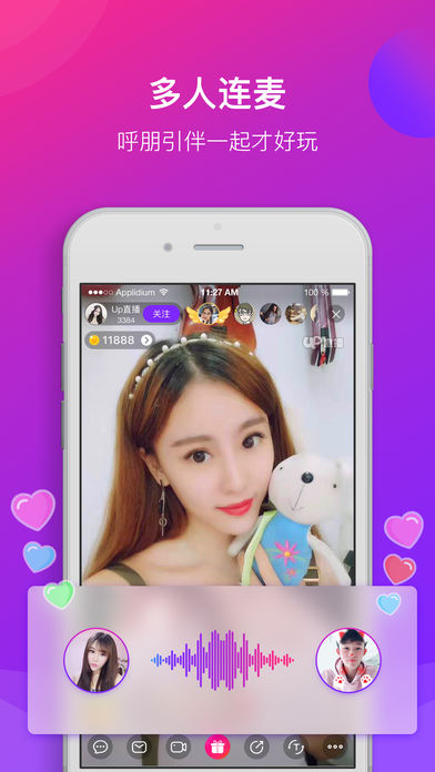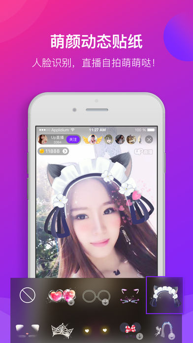 Up直播是一款真人视频社交直播平台,遇见同城的主播,明星和附近的TA! 【全新版本来袭!】 1、私信系统正式登陆Up直播,与好友无限畅聊 2、登录签到有惊喜,赶快来发现吧! Up直播-视频社交,想Up就Up! Up直播,2017流行全世界的手机视频直播社交平台,各地的网红和明星都在玩。 汇聚全球千万用户,邀约明星、超模、演员、素人主播超过10000余人。Up直播有映客的主播颜值,有超过花椒的动态精美礼物。实时与Ta互动逗乐,让人与人的距离不再遥远。 特色功能 【实时直播】你的精彩与美丽,我们为您实时直播; 【互动礼物】你分享精彩,我为你喝彩,城堡名车砸过来; 【智能美颜】全自动智能美颜,只为展示你最美好的一面; 【多人连麦】四人直播连麦,带上主播和两个小伙伴来High; 【短视频分享】分享最美一刻给你的朋友吧! 问题反馈请联系:微信服务号“Up小助手” 商务合作请邮件:upbd@asiainnovations.com UP官网:http://www.upliveapp.com/upweb/index.html 智能美颜由Faceu提供支持