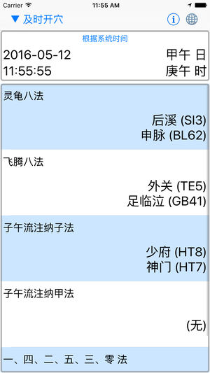您是针灸师吗? 或着您想要活得更健康? 本应用可告诉您每个时辰该点什么穴。 可用穴法: - 灵龟八法 - 飞腾八法 - 子午流注纳子法 - 子午流注纳甲法 - 1-4-2-5-3-0 法