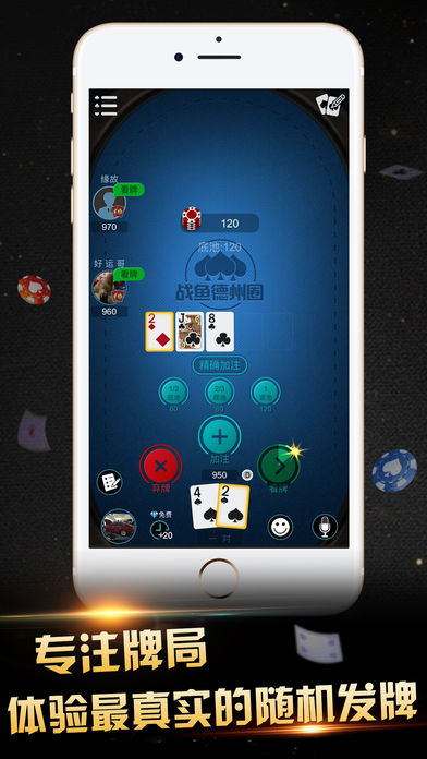 战鱼德州圈,专为德州扑克玩家量身定制的一个社交与游戏平台,专注于私人德州圈子,提供最专业、最真实的游戏环境。 游戏特色: -德州大部落,享不尽的牌局; -经典德州、奥马哈更多游戏尽在战鱼德州圈; -实时战绩,游戏数据实时记录,关键数据云端存储,安全方便; -德州俱乐部,快速组建您的百人甚至千人俱乐部,随时开局,不受地域限制; -全面数据统计,记录你的牌手生涯数据,盈利曲线,方便你合理安排游戏时间; -专业分析,权威专业的数据分析,帮助确定您自身的打牌风格,提升技术水平; -德州扑克高级模式—ANTE,自由设定ANTE大小,自由掌控加快牌局节奏; -保险模式,好牌All-in再也不用担心被BB,体验加倍; -更多专业功能,等你来发现…快来加入我们吧!