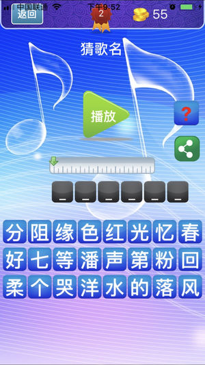 目前最热门的猜系列游戏,我们又出猜歌达人了。 游戏玩法非常简单,通过试听一小段歌曲,然后从备选文字中找出歌曲名字即可完成一关。 喜欢流行歌曲的达人快来挑战吧,看谁能玩通关呀!