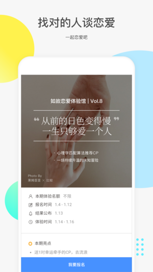 “如故”是一款专注人群匹配的社交App,致力于为你的所有社交需求找到那个“最match的人”,或许是「完美契合的恋人」,是「志趣相投的玩伴」,也或许就是个「相聊甚欢的陌生人」。如故心理学博士们致力于研究人和人在不同场景下的相处方式,以及能真正互相吸引欣赏的奥秘所在。20多道基础题,每一道都经过了上万人,数万段不同关系的测试及验证。 如故怎么玩? 【内心测试】社会心理学家团队精心打造的内心测试题,使你深入了解自己 【人类筛选器】36项筛选条件,无论你想找朋友、找室友还是找旅友,只有输入姿势正确,什么怪咖都能找到 【毛玻璃头像】聊天越深入头像越清晰,未谋面、先知心 【恋爱体验馆】7X24小时为…